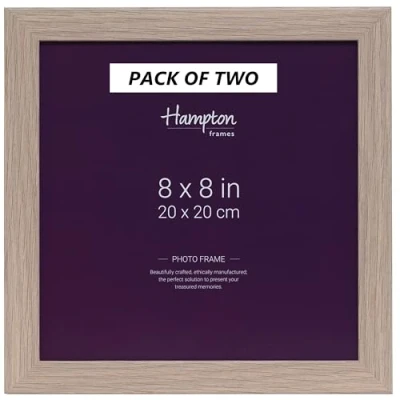 Pack of 2 - Paperwrapped Wood Effect Engineered Wood Picture Frame with 20mm Wide & 12mm Deep Profile. Acrylic (Non-Glass) Aperture(s) Suitable For Image Size of 20 x 20 cm or 8 x 8 Inches With a Viewable Aperture of 19.4 x 19.4 cm. All Sizes Are Approximate and For Guidance 8x8 (20x20cm) Square Frame Made From Oak Effect Paperwrapped Wood Effect MDF. Supplied Shrinkwrapped and Boxed Drop In Back with Retaining Clips and Hanging Loops. Rear Rebate Size 20.4 x 20.4 cm. All Sizes Are Approximate and For Guidance Oak Effect Photo Frame Suitable For Both Freestanding or Wall Mounting in Landscape or Portrait Orientation