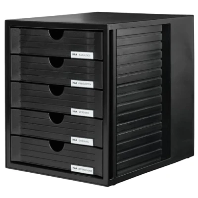 For more order on the desk or in the office shelf: The Han drawer box impresses with its attractive look and ensures optimal organisation in the workplace The sturdy case uses the desk storage system with closed, easy-running drawers can be easily stacked and is therefore a space-saving organiser for papers in DIN C4 format Perfect for folders and documents: The individual drawers are suitable for documents and office accessories up to a size of DIN C4. Includes labelling clips The outer height and depth of the innovative storage box equipped with rubber feet is adapted to folders and therefore also ideal for cabinet use Box contents: 1 x HAN 1450 13, drawer box system box, for documents up to DIN C4 with 5 closed drawers, leak lock, labelling clips (item No. 1021) and rubber feet. Original Han branded product, protected in taste pattern. Made in Germany. External dimensions (W x D x H): 275 x 330 x 320 mm. Colour: black 5 generous drawers which hold C4 sized documents comfortably. Made from 100% recycled materials The base of the unit has rubber feet to ensure stability and to protect furniture Size (W x H x D): 275 x 320 x 330 mm Drawers have a comfortable recessed grip, labels and drawer stoppers