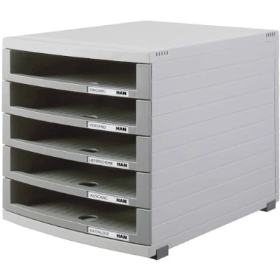 Established design features a harmonious appearance. Thanks to the innovative and patented connectors an arbitrary number of elements can be individually interlinked to grow into an excellent organization solution. Easy-running, high drawers on particularly stable guidings with drawer stop and finger hole for easy retrieval. Drawer inserts for storing sundries are available separately. (HAN Item #: 1514) With 5 high open drawers for formats A4/B4/C4. Suitable also for large folders. Separate limiting bars hold smaller formats e.g. A4-sized documents in perfect position. Supplied with labels. High and shallow drawers are interchangeable depending on the volume requirements. Can grow into large filing walls. 3 different bases are available separately. (HAN item #: 1513, 1515, 1516) Original HAN branded goods. Protected by design rights. Made in Germany.
