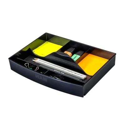 Innovative drawer insert with 6 different sized compartments and handle that can also be placed perfectly on the box with the integrated stacking rib Highest quality design. Whether pens, sticky notes, highlighters, paper clips and other small utensils quickly find a place in use and are always at hand Keeps your drawer box, on the desk or even in the desk drawer Fits perfectly into the Han Impuls, cabinet set/system box and contour drawer boxes (item no. HAN 1012, 1013, 10128, 1401, 14018, 1450, 14508, 1503 and 1505) Box contents: 1 x Han 1016-13 drawer insert with 6 compartments and handle. Original Han branded product. Design protected. Made in Germany. Colour: black. Made in Germany: Han is one of the leading German brand manufacturers of organisational solutions for office and home and has been producing for over 65 years, partly still by hand, at its headquarters in Germany. Through sustainable production, trade and economy, we create and secure jobs with fair wages and salaries.