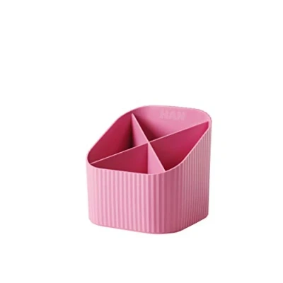Re-X-LOOP combines a modern, functional design with resource-saving materials made from 100% recycled plastic. Can be extended with many other items from the HAN Re-Loop series Whether in the office or at home, the Re X-LOOP desk holder provides more space and order on your desk. Robust and stable thanks to high-quality premium quality The 4 different height compartments offer plenty of space for pens, brushes and other utensils. Lower front lip for easier access The pen holder made of durable plastic is easy to wipe clean and thus sets fresh accents on the desk even after a long time Box contents: 1 x HAN 17238-956 Re-X-Loop desk holder made from 100% recycled plastic. Original Han branded product, protected in taste pattern. Made in Germany. Contents not included. External dimensions (W x D x H): 111 x 111 x 105 mm. Colour: pink