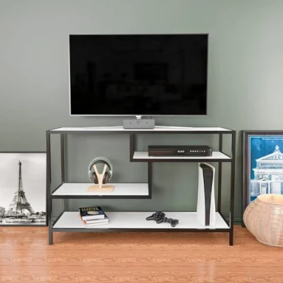 Stylish and modern design featuring a sleek black and white color scheme, perfect for enhancing any living room decor. Constructed from 100% melamine coated particle board, ensuring durability and resistance to scratches and stains. Sturdy metal frame provides excellent support and stability, accommodating TVs up to 55 inches. Generous dimensions of 120 cm width, 39 cm depth, and 75 cm height offer ample space for your entertainment devices and decorative items. Easy to assemble with clear instructions, making setup a breeze for anyone.
