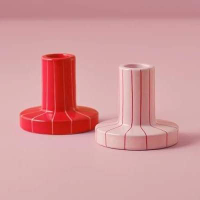 Set of 2 beautifully hand-painted ceramic candle holders Red ceramic holder with pale pink stripes, pink holder with red stripes Each holder measures 8cm W x 7.5cm H, 2.2cm D Each holder measures 8cm W x 7.5cm H, 2.2cm D Designed to hold standard dinner candles (2.2cm diameter)