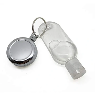 Hand Sanitiser Bottle 30ml Refillable Quality Empty Plastic with Hook Belt Clip Chrome Retractable Reel Attach to Your or Trousers PCL Media ltd