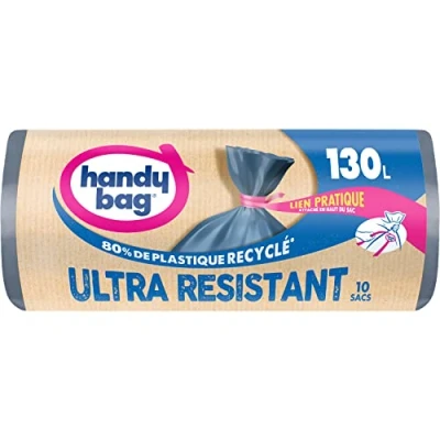 Handy Bag Rolls of 10 Bin Liners, 130 L, Heavy Duty, 80 x 120 cm, 80% Recycled Plastic, Practical Tie Closure, 3 Ply, Leak Proof, cm