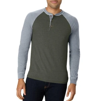 Hanes Men's T Shirts, BeefyT Henley Cotton Long Sleeve Camouflage Green/Oxford Gray, XL