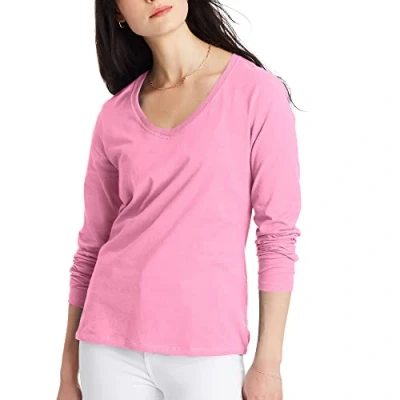 Hanes Women's Originals Long Sleeve Cotton T Shirt, Lightweight V Neck Tee, Modern Fit, Pink Swish, XXL