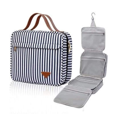 【Waterproof & Leak-proof Interior Design】- Not only will your toiletries not leak out into your suitcase during travel, but you can also use this in the shower as an organized shower bag since the material can easily stand up to water. 【Sturdy Hook Design】- Built-in hook allows hanging the toiletry kit from towel rack, coat hook or whereever is available, making your toiletries and cosmetics displayed well for easy access and save space as well. 【Large Capacity】- You can put your make-up, shampoo, toothbrush, toothpaste and so on, all in one place. Make your travel comfortably to have all your necessities in one bag. 【Multiple Compartments】- Four interior main compartments keep your toiletries and cosmetics in place, and a front zipper pocket that provides extra storage with easy. 【Premium Zippers & Machine Washable Materials】- Soft & padded stripe fabric, reliable double zippers , every detail is delicately made, giving you a high-quality using experience which will last for a long time.