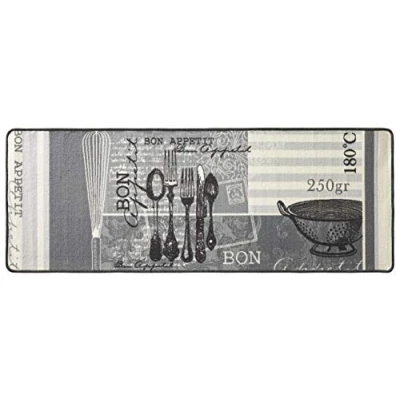 A modern accessory for the kitchen, which can be combined in many ways with different interior styles and sets a special accent in the kitchen Not only an eye-catcher, but also practical: high-quality workmanship made from 100% polyamide ensures durability, durability and easy care A non-slip latex backing prevents slipping even on smooth floors. The runner can also be easily laid out in all rooms with underfloor heating. A colour-coordinated edging rounds off the overall package perfectly. Care instructions: vacuuming runners regularly. For cleaning the waste, we recommend a standard carpet foam. Technical data: material: 100% polyamide; total height: approx. 9 mm; total weight: approx. 1800 g/m². Box contents: Hanse Home Bon Appetit kitchen runner, short pile runner (67 x 180 cm, non-slip back coating, bound all around, durable and easy to clean), grey and white