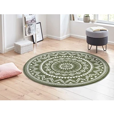 The round rug comes in a modern mandala design, which makes it perfectly integrated into your existing home style. Perfect for your hallway, kitchen, living room, bedroom, dining room or children's room Colour-matched edging on all sides of the rug rounds off the overall picture perfectly. The high-quality workmanship and its synthetic fibres made from 100% polypropylene make the carpet extremely durable and can be cleaned by washing with carpet shampoo thanks to the synthetic fibres Suitable for all types of floors: the rug is suitable for all types of floors such as: parquet and laminate floors. Our short pile rug is ideal even for underfloor heating Quality and short transport routes are very important to us, so all of our products are made in Europe