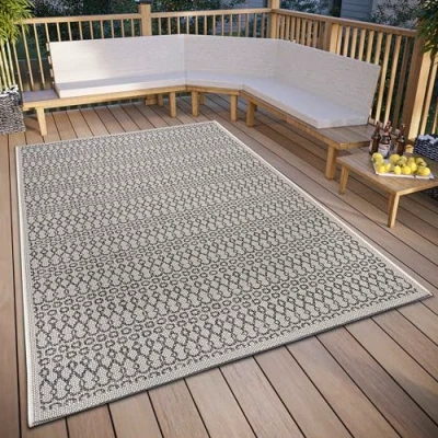 FLAT WOVEN OUTDOOR RUG - Durable rug with flat weave structure, ideal for outdoor use on patio, balcony or in the garden. WEATHERPROOF AND UV RESISTANT - The rug is specially designed to withstand a wide range of weather conditions and is also UV resistant to protect against fading from sunlight. Durable and easy to clean: this rug is extremely durable and can be easily cleaned with water and mild detergent. Suitable for underfloor heating: the rug can also be used indoors, such as living room, and is suitable for use on underfloor heating. Wide range of uses: the rug is not only suitable for outdoor use, but can also be used indoors as a stylish addition.