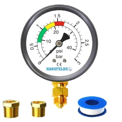 ✅ Key Features: ✔ Measuring range: 0–3 bar / PSI ✔ Robust 63 mm dial: Provides excellent readability under all conditions ✔ 1/4" BSP bottom connection: Allows easy installation and secure fitting ✔ Brass internal connection: Ensures corrosion resistance and reliable sealing ✔ Dual scale (Bar/Psi): Flexible for measuring in either unit ✔ Accuracy Class 1.6: Ideal for precise measurements Precise pressure measurement up to 3 bar / PSI. 💡 Suitable Applications: ✔ Pool filter pressure gauge, water pressure tester for swimming pool filters, pumps, and fish ponds ✔ 63 mm dial with dual scale (Bar/Psi) 📦 Package Includes: ✔ 1 x Hansfelds Pressure Gauge (Bar/PSI) ✔ 2 x Brass reducer adapters: 1/4" female – 3/8" male and 1/4" female – 1/2" male ✔ 1 x Teflon tape 1/4" BSP bottom connection