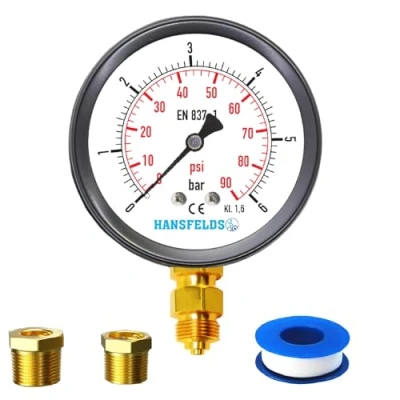 ✅ Key Features: ✔ Measuring range: 0–6 bar / PSI ✔ Robust 63 mm dial: Provides excellent readability under all conditions ✔ 1/4" BSP connection: Allows easy installation and secure fitting ✔ Brass internal connection: Ensures corrosion resistance and reliable sealing ✔ Dual scale (Bar/Psi): Flexible for measuring in either unit ✔ Accuracy Class 1.6: Ideal for precise measurements 💡 Suitable Applications: ✔ Industrial pressure systems ✔ Hydraulic and pneumatic systems ✔ Refrigeration and air conditioning systems ✔ Water supply systems ✔ Mechanical engineering and manufacturing ✔ Research laboratories and testing facilities ✔ 63 mm dial with dual scale (Bar/Psi) 📦 Package Includes: ✔ 1 x Hansfelds Pressure Gauge (Bar/PSI) ✔ 2 x Brass reducer adapters: 1/4" female – 3/8" male and 1/4" female – 1/2" male ✔ 1 x Teflon tape 1/4" BSP bottom connection
