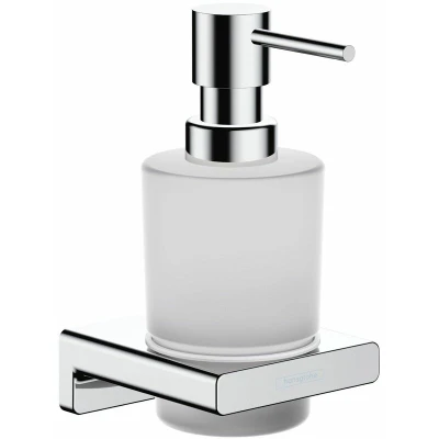 General description Hansgrohe's AddStoris range features angular ultra-modern designs in three sleek finishes: matt black, brushed black, and chrome. These stylish pieces are perfect finishing touches for a contemporary bathroom, ensuite, or WC. Testament to Hansgrohe's quality manufacturing, AddStoris accessories come with a 5-year guarantee, ensuring longevity and functionality without compromising on aesthetics. Technical specifications Finish: Chrome Material: Stainless Steel (holder), Matt Glass (container) Height: 158 mm Width: 81 mm Length: 91 mm Filling capacity: 200 ml Dosage: 2 ml Diameter drill hole: 6 mm Drilling distance: 26 mm Installation Wall-mounted design Concealed fastening for a pristine look Includes mounting material Usage This liquid soap dispenser is designed for use with liquid soap, providing a convenient and stylish solution for your bathroom needs. Other information 5-year guarantee covering the original purchaser and installation No plastic components