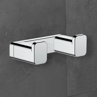 General description Hansgrohe's AddStoris range features angular ultra-modern designs in three sleek and versatile finishes: matt black, brushed black, and chrome. These stylish pieces are perfect finishing touches for a contemporary bathroom, ensuite, or WC. Testament to Hansgrohe's quality manufacturing, AddStoris accessories come with a 5-year guarantee, ensuring longevity and functionality. Technical specifications Finish: Chrome Material: Stainless Steel Height: 21 mm Width: 66 mm Length: 36 mm Drilling distance: 50 mm Diameter drill hole: 6 mm Weight: 1 kg Compatibility and accessories Includes mounting material Concealed fastening Installation Wall-mounted Drilling distance: 50 mm Diameter drill hole: 6 mm Usage Designed for hanging robes and towels Ideal for contemporary bathroom settings Other information Quality manufacturing with metal fixings and parts 5-year guarantee covering original purchaser and installation