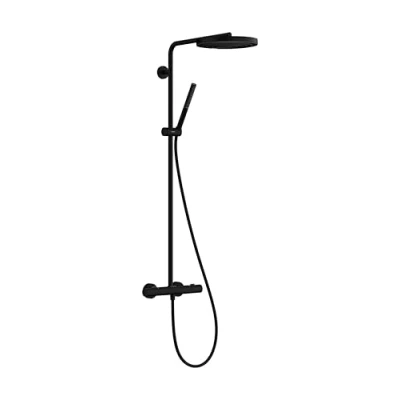 hansgrohe Pulsify S Puro shower system with thermostat, rainfall head (260 mm), hand (1 spray), hose, rail and round matt black, 24222670