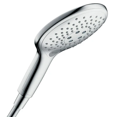 Hansgrohe Raindance Select 150 S 3 spray shower head. The Raindance Select S 150 3jet hand shower with its chrome surfaces and beautifully rounded XXL shape is pure pleasure, switching from one spray type to the next at the touch of a button: for relaxing, invigorating or refreshing showering comfort. Experience water in its most beautiful form with the Raindance Select S hand shower 150 3jet! Here, the functionality, ergonomics and design are truly impressive: 150 mm shower heads promise showering indulgence on a grand scale. A symmetrically round silhouette and gleaming chrome surfaces make a timeless design statement, which is in keeping with both classic and modern bathrooms. Limescale deposits on the nozzles are easy to rub off using your finger (QuickClean), guaranteeing long-term, uninterrupted enjoyment of the product. With its XXL surface area, the shower head is the source of full-scale water indulgence. Your range of shower features includes three different spray types: The RainAir soft shower rain produces soft beads of water that are enriched with air (AirPower). The CaresseAir massage spray leaves you feeling invigorated thanks to the impact of 5 intensive individual sprays. The Mix full shower function completes the range of spa features, with a combination of both spray types. The soft shower rain at the outer edges and the refreshing massage spray in the middle produce a sensation that really wakes up your senses, at a pleasantly concentrated intensity - as demonstrated below. Shower head size - 150 mm Select button to comfortably switch between spray modes 3 spray patterns - RainAir (rain jet enriched with air), CaresseAir, Mix operating pressure: min. 1.5 bar / max. 6 bar hand shower can be used with sliders that are infinitely adjustable in the incline. The hand shower should not be used for sliders with two predefined positions. Connection thread 1/2" 5 year Manufacturer's guarantee @TrCtMSV-19k@ Genuine brand new hansgrohe product, covered by a hansgrohe manufacturer's guarantee.