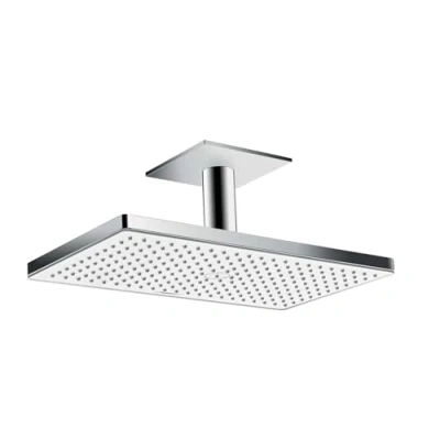 Luxurious rain shower with impressively large spray disc made of white plexiglass Indulgent showering: The 466x270 mm shower head pampers users with an even, luxurious water flow (XXL Performance) The flow rate of the Rain shower jet type is max. 21 l/min (at 3 bar) Captivating look: The shiny chrome and white in the surface finish blend to form a distinctive design Easy to clean: limescale can be removed by simply wiping over the silicone nozzles on the shower head (QuickClean) Comes with shower arm and ceiling connector: ensures the shower head is in the perfect position (length: 100 mm) Newer for longer: The spray disc on the overhead shower can be removed, making it easier to clean, Weight: 11.243575362 Pounds, Manufacturer: Hansgrohe