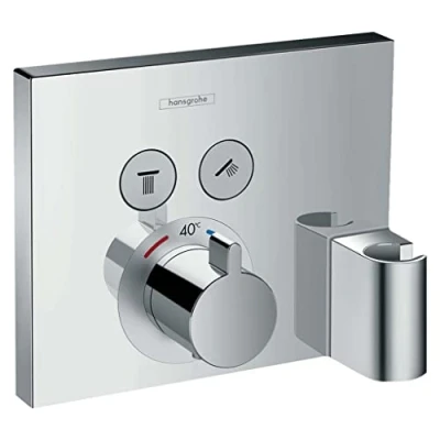 Consists of: Thermostat, shower holder 2 functions Simultaneous use of several outlets Select push-button on/off control for 2 outlets Thermostat cartridge, Start/stop valve to operate the functions Maximum flow rate at 3 bar: 29 l/min Flow rate upper outlet: 29 l/min, Weight: 0.041446905256 Pounds, Manufacturer: Hansgrohe