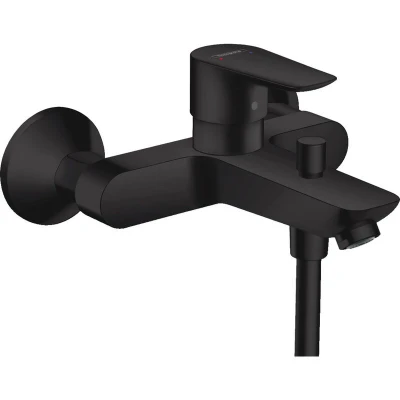 General description The Hansgrohe Talis E Single lever manual bath mixer is designed for exposed installation, featuring a sleek matt black finish. This mixer is engineered to operate two outlets, providing both functionality and style for your bathroom. Technical specifications Spout length: 194 mm Connection type: S connections Centre distance: 150 mm ± 12 mm Maximum flow rate (at 3 bar): 19.2 l/min Flow rate for bath spout (at 3 bar): 19.2 l/min Flow rate of hand shower (at 3 bar): 16.8 l/min Ceramic cartridge Weight: 2.9 kg Other information Maximum temperature can be adjusted on installation Diverter with automatic resetting Includes silencer Noise class: I Material: Brass Colour: Matt black Manufacturer warranty: 5 years