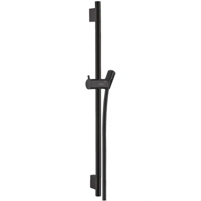 hansgrohe Unica Shower Rail S Puro - 65cm with Shower Hose - Matt Black. Consists of: shower bar, shower hose, slider Profile shower bar: round Shower bar diameter: 22 mm Metal hand shower holder and shower holder with locking mechanism Adjustable angle/tilt 5 year manufacturers guarantee Genuine brand new hansgrohe product, covered by a hansgrohe manufacturer's guarantee.