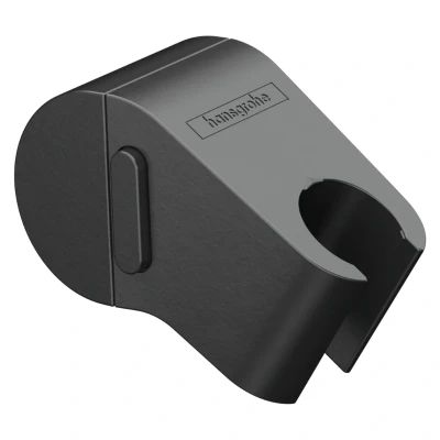 Hansgrohe WallStoris Push Slider - Matt Black (27917670). Material: plastic. For shower hoses with a conical nut. Height-adjustable slider with locking push-button slider. Slider is rotatable – can be used on vertical and horizontal wall bars. Also known as a clamp bracket assembly, shower head bracket, slider assembly, or a handset / handshower / shower head holder. Genuine brand new hansgrohe product, covered by a hansgrohe manufacturer's guarantee.