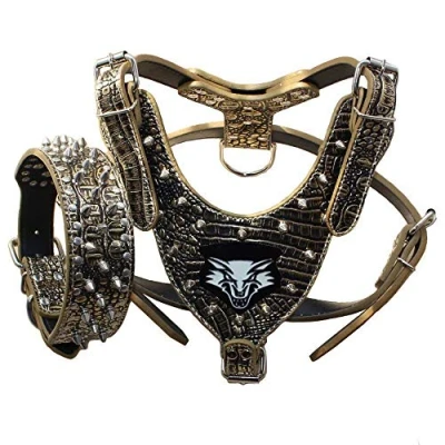 Material:Strong and durable high quality PU (Faux) leather. Light, elegant and not stiff, Studded Spiked, fashion design.Soft Leather Hand Strip,Make your Walking more Convenient and Comfortable. Harness size:Harness size:Neck size 45-60CM(17.5-23.5"), Chest size 65-85CM(26-34") Collar size: S:Neck size for 15-18 inches(38-46cm) M:Neck size for 17-20 inches(43-51cm) L:Neck size for 19-22 inches(48-56cm) XL:Neck size for 21-24 inches(53-61m) Before you order,Be sure your dog's size is suitable for this size (That's very important). Perfect for: Pit bull terrier,retrievers,boxer,shepherds,English/America Bulldogs,Mastiff,Golden Retriever,Labrador,Rottweiler and similar breeds