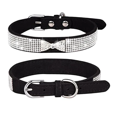 Haoyueer Rhinestone Dog Collar, Cute Dazzling Sparkling Soft Suede Leather Cat Collar Crystal Diamond Pet Puppy (S, Black 3)
