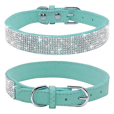 Haoyueer Rhinestone Dog Collar, Cute Dazzling Sparkling Soft Suede Leather Cat Collar Crystal Diamond Pet Puppy (S, Blue)