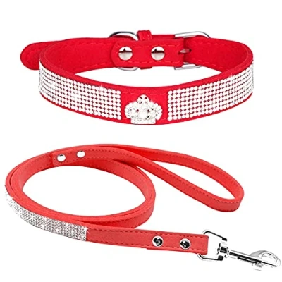 haoyueer Rhinestone Dog Collar, Cute Dazzling Sparkling Soft Suede Leather Cat Collar Leash Crystal Diamond Pet Puppy (S, Red 4)