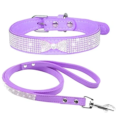 haoyueer Rhinestone Dog Collar, Cute Dazzling Sparkling Soft Suede Leather Cat Collar Leash Crystal Diamond Pet Puppy (XS, Purple 3)