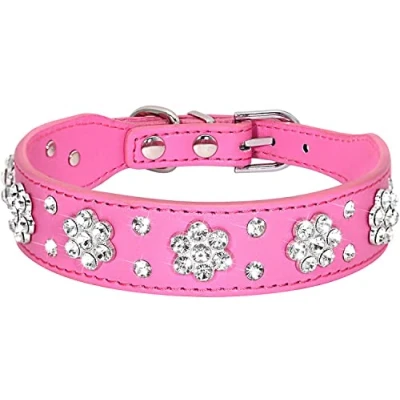 haoyueer Rhinestone Dog Collar, Cute Flower Cat Collar Bling PU Leather Adjustable Sizes Small Medium Large (M, Hot Pink)