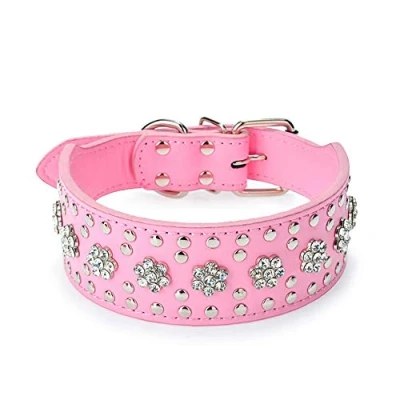 haoyueer Rhinestones Dog Collars Flower Pattern Rhinestone Studded Leather Sparkly Crystal Diamonds Dazzling Sparkling Elegant Fancy PU Collar for Medium & Large Dogs (L, Pink)