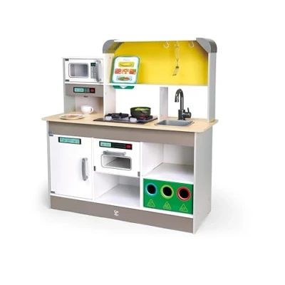 Deluxe play kitchen by Hape for the little cooking masters Incl. microwave, coffee maker, refrigerator, oven, cooker and many accessories With the recipe cards with six different dishes you can spoil every guest The integrated cooker has light and sound and is equipped with a built-in "Funny Frying Pan" Through the waste separator, your child learns awareness for the environment at an early age The kitchen for children from 3 years also contains lots of storage space, Manufacturer: Hape