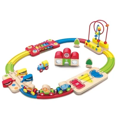 CHILD’S RAILWAY TOY : Puzzle railway with rainbow tracks; Make playtime learning time with this colourful railway set; ideal ly designed for ages 18 months and up MULTIFUNCTIONAL DESIGN : Includes four different tracks consisting of a bead maze, a shape sorter, a xylophone and a tambourine; Each comes with different functions, adding to the fun EDUCATIONAL TODDLER TOY : The shape sorter track develops shape/colour cognition and hand-eye coordination; Playing with the bead maze helps develop dexterity and stimulates learning and problem-solving CHILDREN TRAIN SET : Enjoy the musical tones of the xylophone and the jingle of the tambourine as the train passes by; This train track promises hours of fun for your little one DEVELOP KEY SKILLS : Blocks help toddlers develop gross motor skills; Try different block arrangements or pile them high to form a mighty tower, The optical and audio features stimulate vision and hearing development COMPATIBILITY : The Hape Rainbow Puzzle Railway grows with your child and works with most other wooden rail sets, Manufacturer: Hape