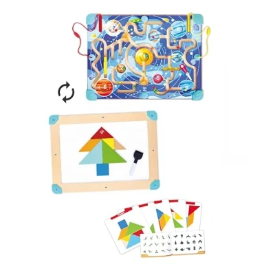 DUAL-FUNCTION DESIGN: This toy is a real game-changer with its dual-function design; one side is a magnetic maze with a space-themed adventure that lets your children explore the cosmos; the other side is a whiteboard paired with tangram COSMIC MAGNETIC MAZE: With its intricate tracks and colourful beads, children can use the magnetic pen to move the beads around and even fire up the steel balls in the maze full of space elements FUN TANGRAM CHALLENGE: The tangram side is a progressive journey; from shape recognition to creative building, it takes children through different 3 levels of difficulty, sharpening their problem-solving skills EXTRA DRAWING FUN: Flip the board to reveal a whiteboard where children can draw, doodle, and solve problems, enhancing their imagination and fine motor skills INCLUDES HELPFUL GUIDES: There's a tangram playbook and a manual filled with 150 transformations; the playbook provides black pattern challenges and colourful answers, helping children learn shapes and develop spatial imagination, Manufacturer: Hape