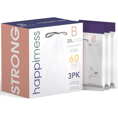 happimess HPM3000B WHITE 5.3 Gallon Drawstring Trash Can Liner, White, 60 Count, 3 Packs of 20 Liners