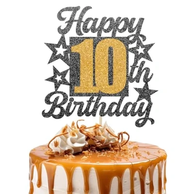 Happy 10th Birthday Cake Topper Black and Gold Glitter Number 10