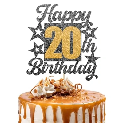 Happy 20th Birthday Cake Topper Black and Gold Glitter Number 20