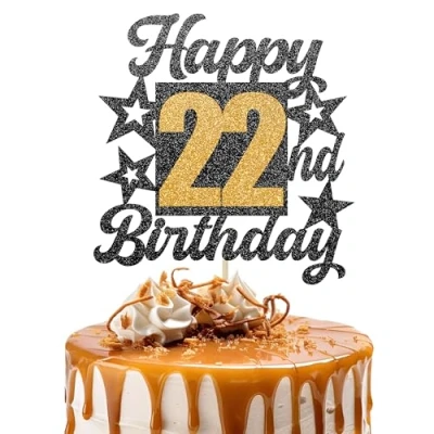 Happy 22nd Birthday Cake Topper Black and Gold Glitter Number 22