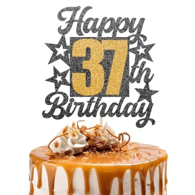 Happy 37th Birthday Cake Topper Black and Gold Glitter Number 37