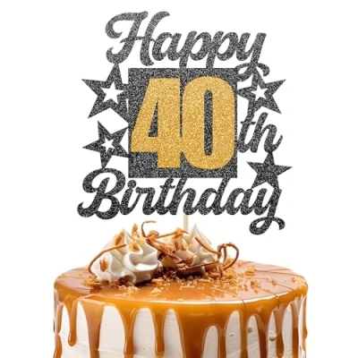 Happy 40th Birthday Cake Topper Black and Gold Glitter Number 40