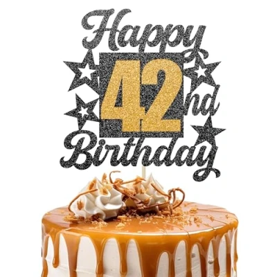 Happy 42nd Birthday Cake Topper Black and Gold Glitter Number 42