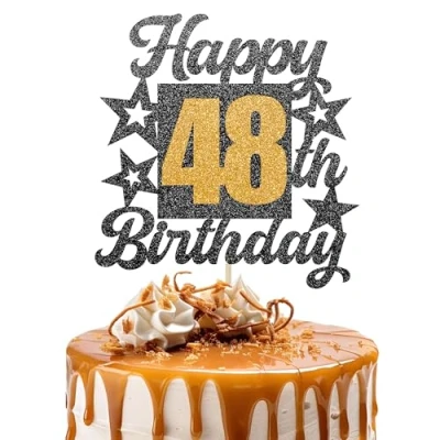 Happy 48th Birthday Cake Topper Black and Gold Glitter Number 48