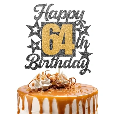 Happy 64th Birthday Cake Topper Black and Gold Glitter Number 64