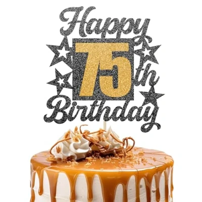 Happy 75th Birthday Cake Topper Black and Gold Glitter Number 75