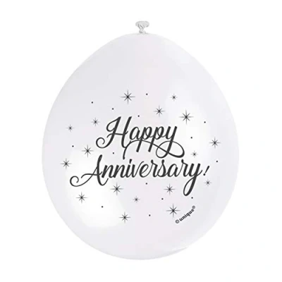 ELEGANT DESIGN: Happy anniversary white latex balloons feature a classy and tasteful white color, perfect for adding a sophisticated touch to your memorable celebrations with family and friends. CELEBRATE SPECIAL OCCASIONS: Adorned with the heartfelt message, "Happy Anniversary," these premium quality balloons will make your anniversaries, whether it's a wedding or milestone, stand out even more with a chic, visual appeal. PACK OF 10: This attractive pack contains ten 22cm balloons, ensuring there is plenty on hand to decorate your entire venue and commemorate your cherished moments together. HIGH-QUALITY MATERIAL: Crafted from durable and sturdy latex, these balloons are designed to withstand the test of time, just like your enduring love and commitment. EASY TO INFLATE: Conveniently simple to inflate using air, helium, or a balloon pump, these balloons are perfect for anniversary dinners, surprise parties, photoshoots, or simply as a thoughtful gesture for your significant other.