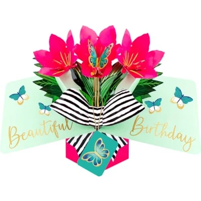 Joyful Love For Her - A joyful pop-up greeting card for women's birthdays, designed to express love and make the recipient feel special and appreciated. Colourful Beautiful Design To Love - This vibrant pop-up greeting card from 'Second Nature Pop Ups' features stunning pink amaryllis flowers and delicate butterflies, perfect for making someone feel loved and cherished. Joyful Celebration And Heartfelt Wishes - With its cheerful caption, "Beautiful Birthday," and a space left blank for your own greeting, this pop-up greeting card is perfect for expressing your joy to her on her special day. Exquisite Craftsmanship, Thoughtfully Designed Elegance - This pop-up greeting card is intricately cut out, foiled, and thoughtfully designed by Second Nature as part of their Second Nature Pop Ups range for women. Each greeting card measures 13.5 x 20 x 0.5 centimetres or 5.25 x 8 x 0.5 inches and is presented with a white envelope. Eco-Friendly Packaging, Easy Postal Compatibility - This product comes in eco-friendly card packaging that fits through your letterbox and requires a Large Letter Stamp for posting. It is made from card sourced from sustainable forests and is recyclable.