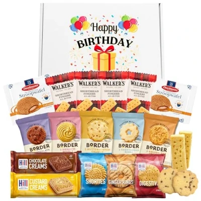 Happy Birthday Biscuits Gift Set Bundle with x35 Individually Wrapped Hamper Border Biscuits, Walkers Shortbread, Custard Creams, Stroopwafels Caramel & More