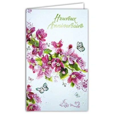 Happy Birthday Card Pink Peony Flowers and Butterflies Made in France
